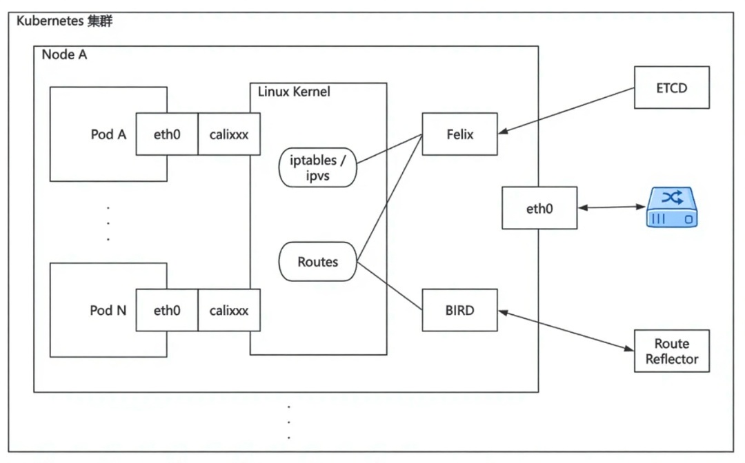 Felix:运行在每个节点的代理程序,主要负责网络接口监听、路由信息管理、ARP 信息管理、ACL 规则管理、上报节点网络状态、创建 Calico 虚拟网络设备(如 tunl0、vxlan.calico)
