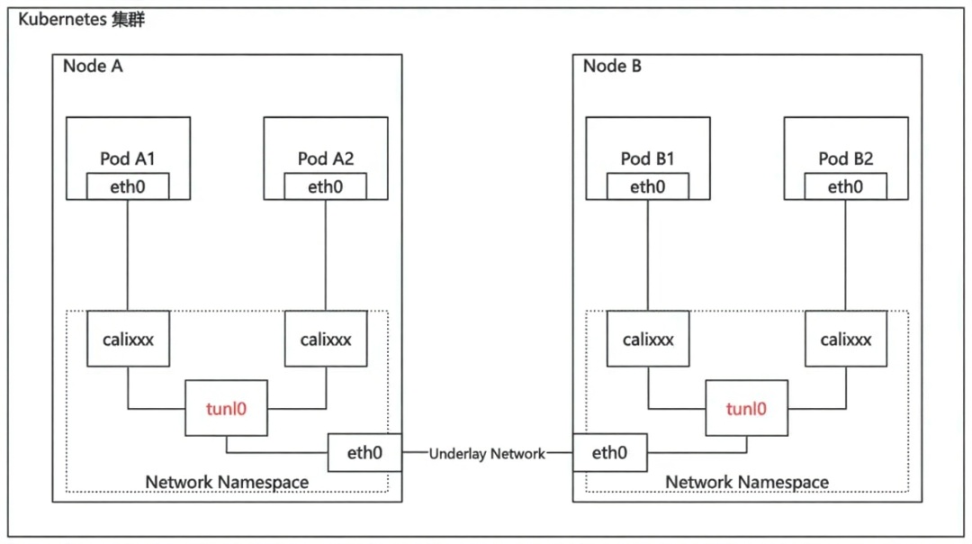 IPIP 模式下的 Calico 会为每个 Node 节点创建一个 tunl0 接口,作为隧道出入口设备,用来封装 IPIP 数据报文,Pod 间的通信经由 IPIP 的三层隧道进行转发