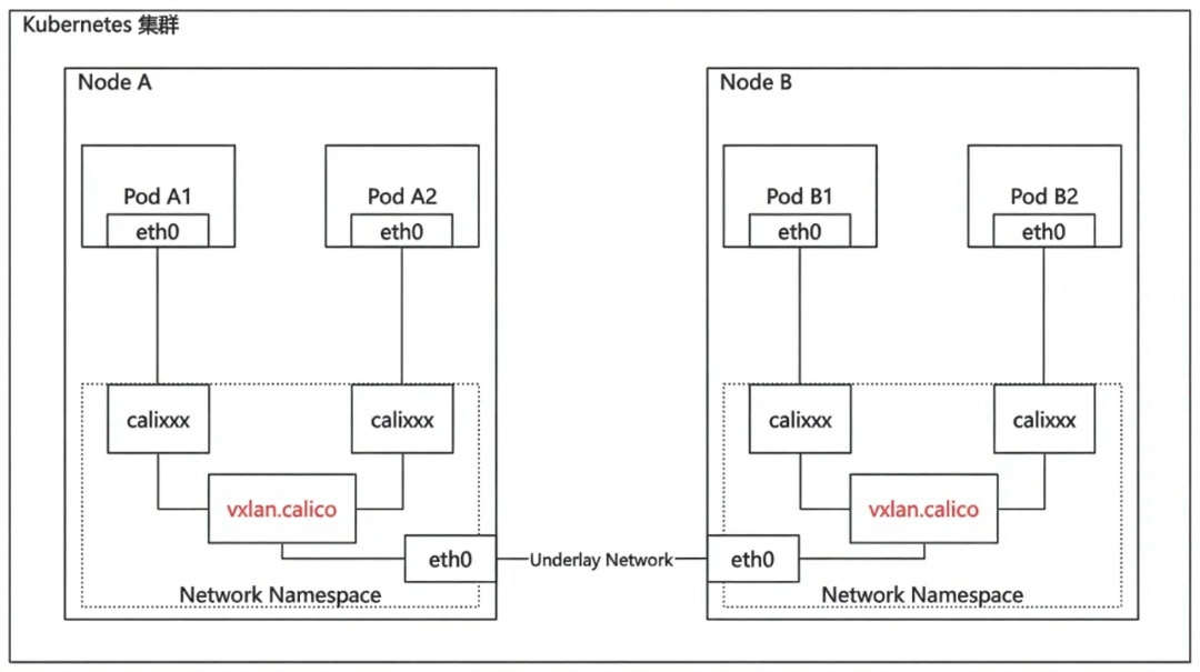VXLAN 模式的 Calico 会为每个 Node 节点创建一个 vxlan.calico 接口,作为隧道出入口设备,用来封装 VXLAN 数据报文,Pod 间的通信经由 VXLAN 的三层隧道进行转发