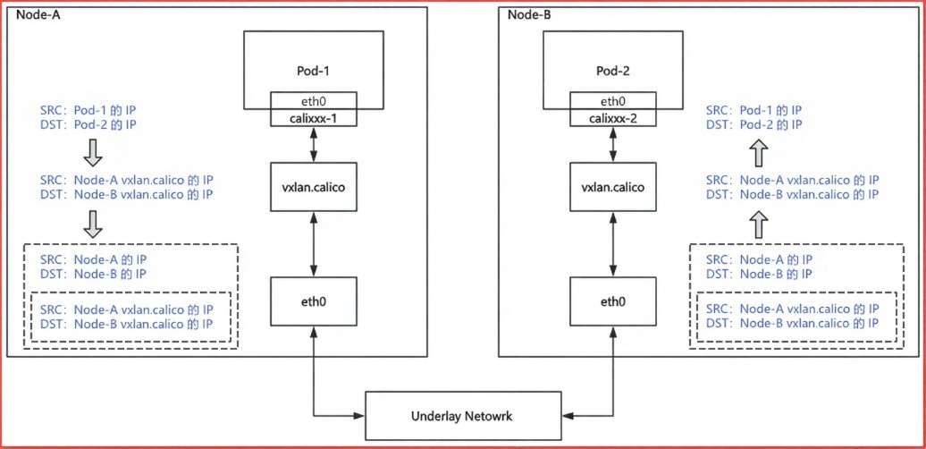 最后,以 Calico 的 VXLAN 模式为例,Pod 流量在 Node 节点间的转发原理大致如下图所示: