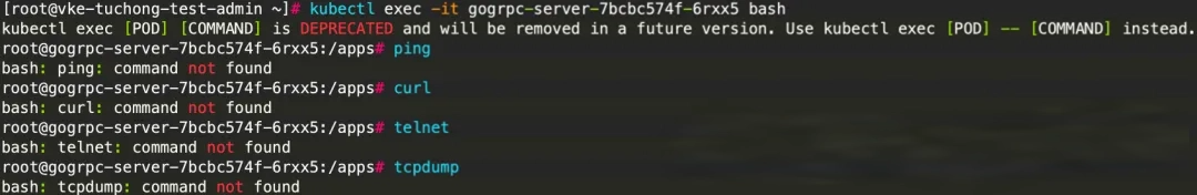 作为对比,进入 Pod 内容器查看是否安装有 ping、curl、telnet、tcpdump 等调试工具,可以看到相关命令都不存在