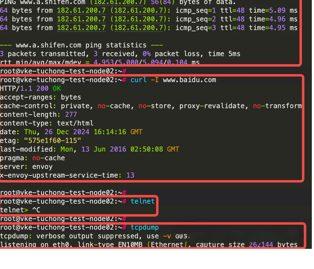 使用 Node 节点已安装的 ping、curl、telnet、tcpdump 等工具进行网络调试接口