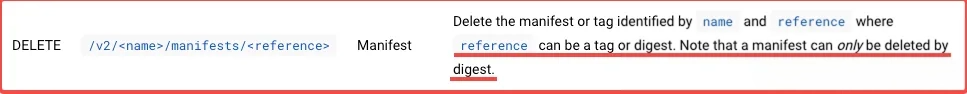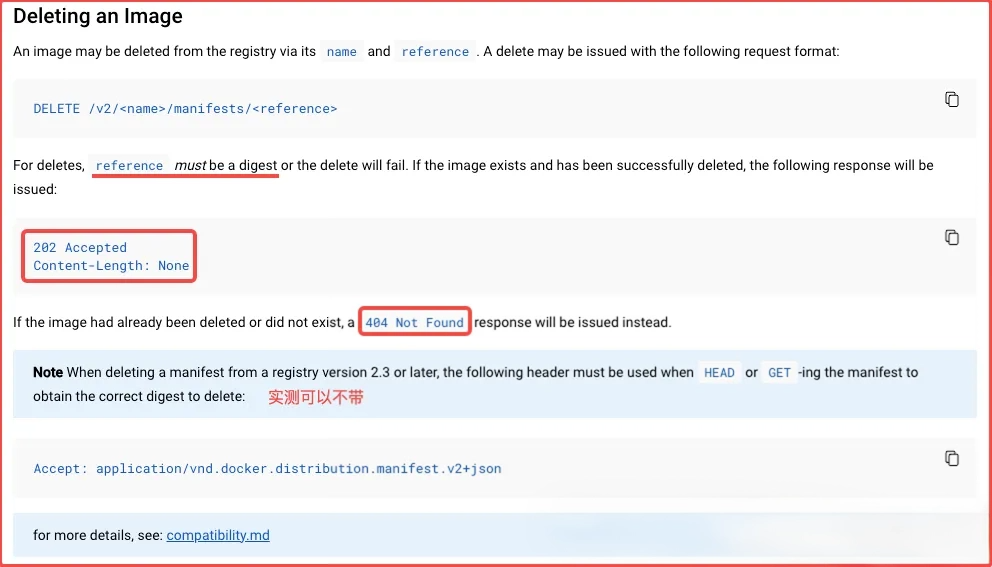# 第一步:参考常用 API 请求,自行获取镜像的 repository 和 digest 信息 # 第二步:删除镜像curl -I -XDELETE 127.0.0.1:5000/v2/<repository>/manifests/<digest> # 第三步:垃圾回收docker exec local_registry bin/registry garbage-collect /etc/docker/registry/config.yml🔔 官方说明:删除镜像时必须指定 digest 信息而非 tag 信息。